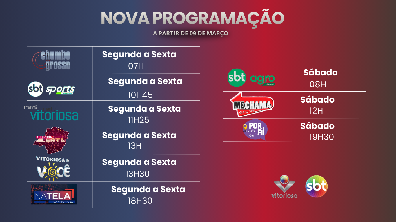 O Grupo Vitoriosa de Comunicações estreia sua nova grade horária para a televisão nesta segunda-feira (9). A partir da próxima semana, a emissora contará com 40 minutos a mais de programação local; garantindo ainda mais conteúdos informativos e que valorizam o jornalismo produzido no Triângulo Mineiro.